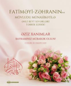 İki dünya xanımlarının Seyyidəsi, hz Peyğəmbərimizin (s) qəlbinin meyvəsi, Cənnət Cavanlarının (Həsəneynin (ə)) anası, Möminlərin Əmirinin (ə) həyat yoldaşı hz Fatimeyi Zəhranın (ə) mübarək mövlüdü münasibətilə başda Zəmanə İmamı (əf) olmaqla, bütün Müsəlman dünyasına təbrik deyirik!