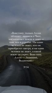 Воистину, только Аллах обладает знанием о Часе, ниспосылает дождь и знает о том, что в утробах. Ни один человек не знает, что он приобретет завтра, и ни один человек не знает, в какой земле он умрет. Воистину, Аллах — Знающий, Ведающий. (Лукман, аят 34)